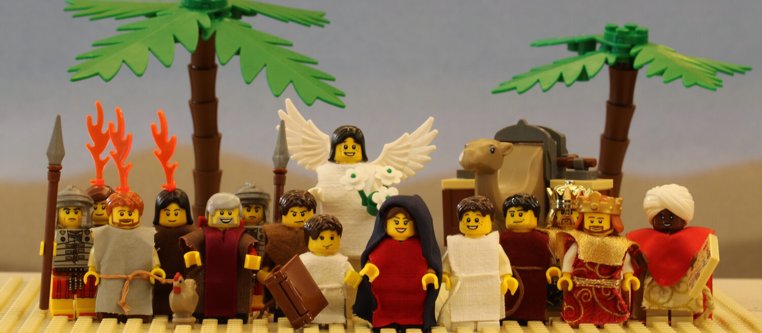 - Jede Szene wird durch ein Aufstellbanner kommentiert, auf welchem der biblische Text zu lesen ist